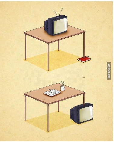게시물에서 첫 번째 그림에는 책상의 짧은 다리부분을 책이 받치고 있고, 두 번째 그림에는 텔레비젼이 그 위치를 대신하고 있다.