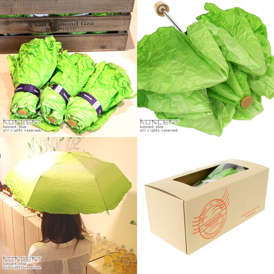 우산을 폈을 때 모양은 그라데이션이 들어간 연두색으로 우중충한 비오는 날 눈에 확 띄도록 제작됐다. 일본의 한 팬시업체가 만든 이 ‘배추 우산’의 가격은 4725엔(한화 약 5만 2000원)이다.