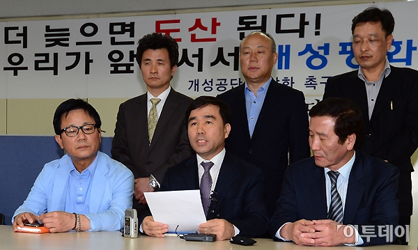 개성공단 출입 차단 48일째를 맞고 있는 20일 오후 서울 여의도 중소기업중앙회에서 개성공단 정상화 촉구 비상대책위원회 소속 기업인들이 기자회견을 갖고 방북 허용을 촉구하고 있다. 노진환 기자 myfixer@