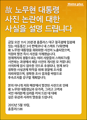 지난 19일 오전 11시 20분경 대구 칠곡점에 입점해 있는 통신사 판매점 내에 위치한 스마트 TV 화면에 故 노무현 대통령을 희화화한 합성사진이 노출됐다. 홈플러스 측은 해당 사진을 삭제하고 유가족과 고객에게 공식 사과했다.