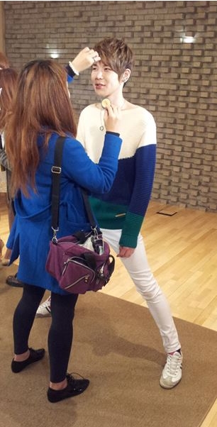 공개된 사진 속에는 한별이 뮤직비디오 촬영 현장에서 메이크업을 받는 모습이 담겨있다. 185cm의 훤칠한 키를 자랑하는 한별이 본인보다 키가 작은 여성 스태프를 위해 다리를 양옆으로 벌리는 ‘매너다리’로 훈훈함을 자아내 눈길을 끈다.