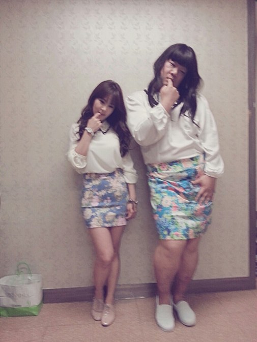 사진 속 김지민과 유민상은 똑같은 꽃무늬 치마를 입고, 벽에 기대 똑같은 포즈를 취하고 있다. 마치 김지민은 김준형의 미니어처처럼 보인다.