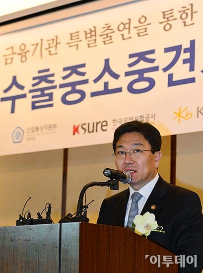 윤상직 산업통상자원부 장관이 20일 오전 서울 중구 웨스틴조선호텔에서 열린 '금융기관 특별출연을 통한 수출중소중견기업 금융지원 협약식'에 참석해 인사말을 하고 있다. 방인권 기자 bink7119@