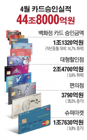 카드승인실적을 업종별로 보면 백화점 카드승인금액은 1조1320억원으로 전년동월 대비 14.7% 줄었고 대형할인점은 2조4700억원으로 0.6% 감소했다. 반면 편의점의 카드승인금액은 3790억원, 슈퍼마켓은 1조7630억원으로 전년동월 대비 각각 28%, 9.8% 증가해 불황형 소비형태가 심화하고 있다.