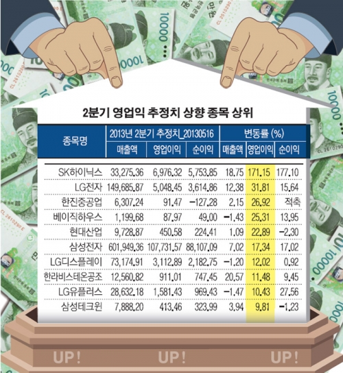 글로벌 경기회복 기대감을 안고 2분기 예상 성적이 가장 큰 폭으로 뛰어오른 종목은 SK하이닉스였다. 3개월전 SK하이닉스의 2분기 영업이익 추정치는 2573억원이었다. 그러나 현재는 6976억원으로 171.15 %나 상향조정됐다.