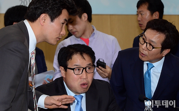 서울시 소재 개성공단 입주기업인 간담회가 21일 오전 서울시청 간담회장에서 열렸다. 간담회가 시작하기 전 최동진 개성공업지구 서울기업협회장(오른쪽)과 박용만 부회장 등이 이야기를 나누고 있다. 노진환 기자 myfixer@