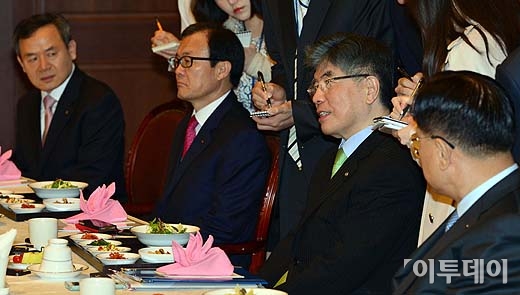 김중수 한국은행 총재가 22일 오전 서울 중구 남대문로 한국은행 본관에서 열린 ‘2013년 5월 금융협의회’에서 시중 은행장들과 이야기를 나누고 있다. 방인권 기자 bink7119@