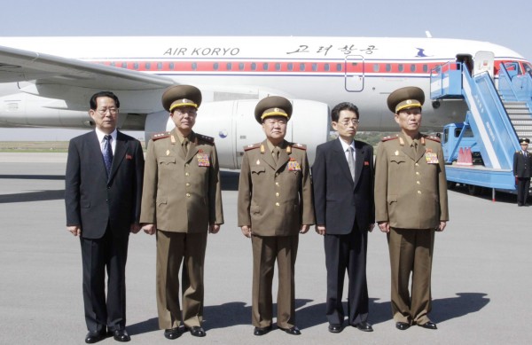 북한 김정은 국방위원회 제1위원장의 특사인 최룡해 인민군 총정치국장(가운데) 일행이 22일 중국 방문을 위해 평양 공항을 출발하기 직전 포즈를 취하고 있다. 왼쪽부터 김형준 외무성 부상, 리영길 군 상장, 최룡해, 김성남 노동당 중앙위원회 부부장, 김수길 군 중장이다.