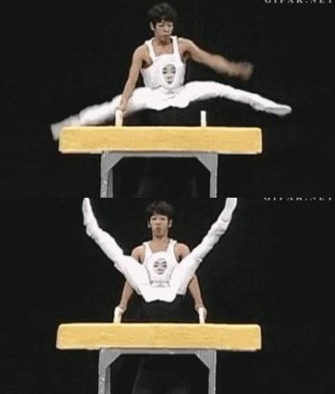 사실은 체조 선수의 다리처럼 보였던 것은 체조 선수 가슴에 있던 다른 남성의 팔이며, 두 사람이 나란히 서서 일종의 마임을 하는 상황이었다.