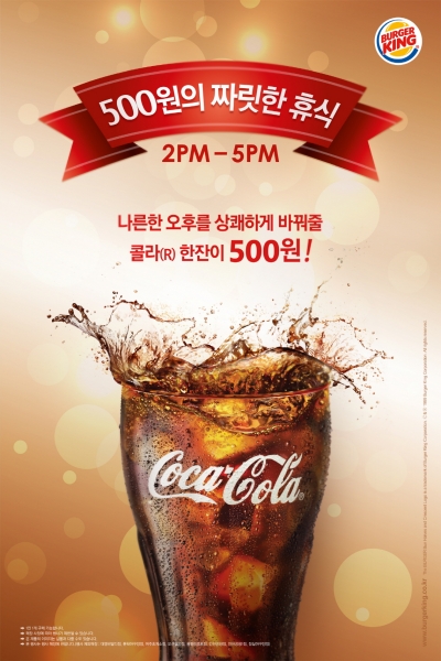 이번 프로모션은 해당 기간 동안 오후 2시부터 5시까지 방문한 고객에게 콜라(R) 단품을 500원에 판매한다. 버거킹측은 갑자기 찾아온 더위에 지친 고객들에게 편의를 제공하고자 이번 프로모션을 기획했다는 설명이다.
