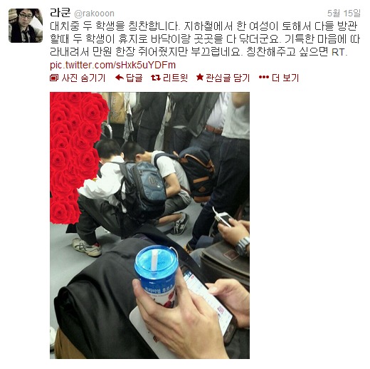 이 트위터 이용자는 이에 대해 이들 중학생은 술에 취한 여성이 지하철 바닥에 구토를 하자 어른들도 선뜻 나서지 못한 상황에서 솔선수범해 토사물을 닦는 등 뒷처리를 했다고 설명했다.
