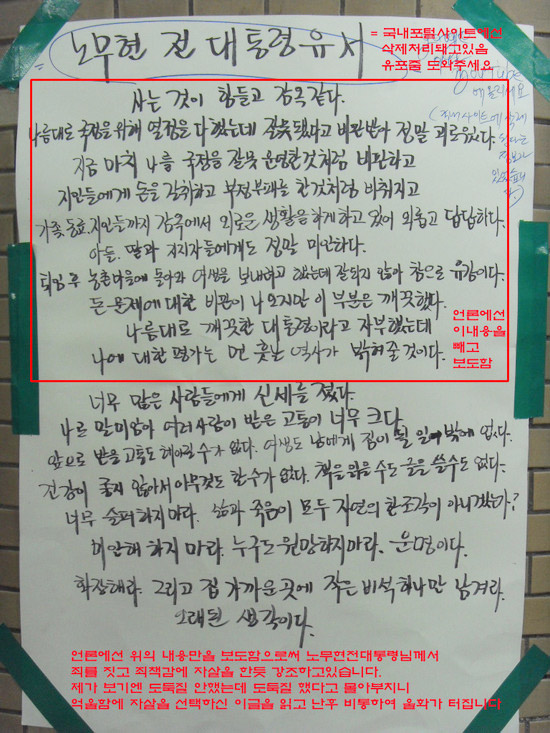 고 노무현 전 대통령 서거 4주기를 맞은 23일 인터넷에 '가짜 유서'가 유포되어 논란이 되고 있다. 문제의 유서는 이제까지 알려졌던 내용 앞에 13줄의 내용이 더 추가되어 있으며 진위 여부에 대해 네티즌의 논쟁이 이어지고 있다. 노무현 재단은 “재단 홈페이지에 공개된 유서 이외에 다른 것은 없다”라고 밝히며 '가짜 유서' 논란에 안타까움을 나타냈다.