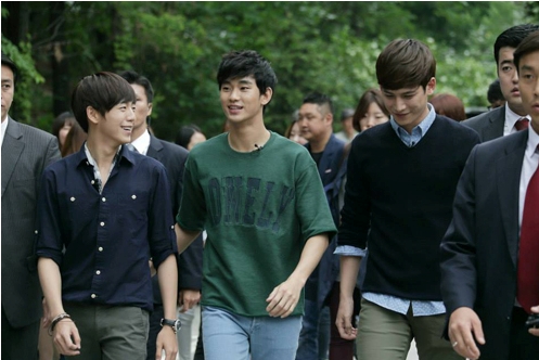 사진 속 김수현, 박기웅, 이현우는 각각 티셔츠, 니트, 셔츠를 입고 수많은 여대생들에게 둘러싸여 있으며 특히 세 사람은 멀리서 찍은 직찍임에도 작은 얼굴과 또렷한 이목구비, 큰 키를 과시해 보는 이들의 시선을 사로잡았다.