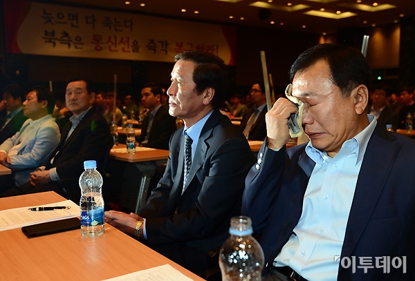 개성공단 출입제한이 51일째 이어지고 있는 23일 오전 개성공단 정상화 촉구대회가 여의도 중소기업중앙회에서 열렸다. 한재권 개성공단입주기업협회장이 경과 보고를 들으며 눈물을 흘리고 있다. 노진환 기자 myfixer@