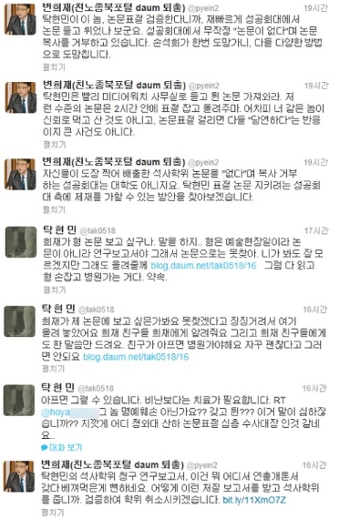 변대표가 표절논문을 숨겼다며 탁교수를 공격하자 탁 교수는 자신의 블러그에 관련자료를 올리는 한편 변대표에게 "아프면 병원가야지"라고 맞받아쳤다.