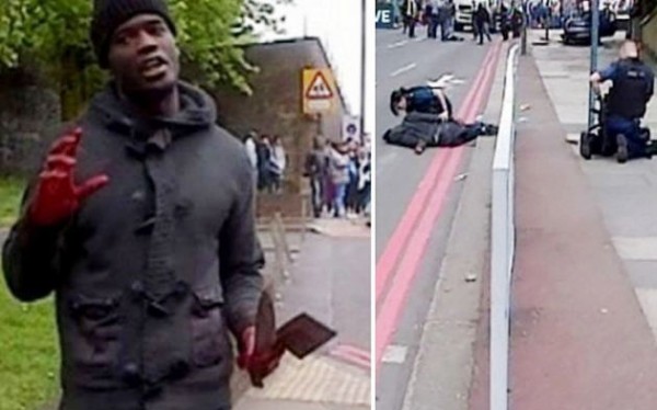 22일(현지시간) 런던 대로변에서 이슬람 급진주의자로 추정되는 용의자 2명이 영국 군인 1명을 잔인하게 살해하는 충격적인 사건이 벌어졌다. 영국 일간지 데일리 메일은 용의자들이 피해자를 참수한 후 이슬람 구호를 외쳤다고 전했다. 용의자가 범행 후 피범벅이 된 칼을 들고 카메라를 향해 외치는 모습(왼쪽)과 쓰러진 피해자를 살펴보고 있는 경찰들.