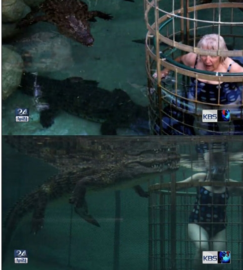 보도에 따르면 할머니의 이 모험은 쇠창살처럼 생긴 보호망 안에 들어가 있어서 악어의 큰 공격은 피할 수 있었다.