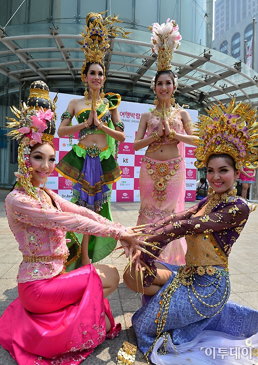 23일 서울 청계광장 앞에서 '2013 하나투어 여행박람회'를 홍보하기 위해 태국 3대 쇼인 '아프로디테쇼' 현지 무용단원들이 공연을 펼치고 있다. 양지웅 기자 yangdoo@