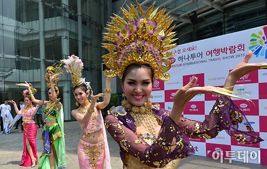 23일 서울 청계광장 앞에서 '2013 하나투어 여행박람회'를 홍보하기 위해 태국 3대 쇼인 '아프로디테쇼' 현지 무용단원들이 공연을 펼치고 있다. 양지웅 기자 yangdoo@