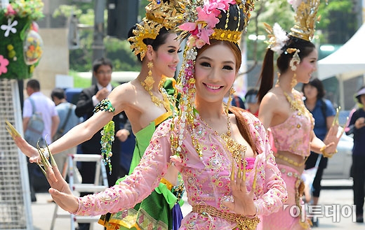 23일 서울 청계광장 앞에서 '2013 하나투어 여행박람회'를 홍보하기 위해 태국 3대 쇼인 '아프로디테쇼' 현지 무용단원들이 공연을 펼치고 있다. 양지웅 기자 yangdoo@