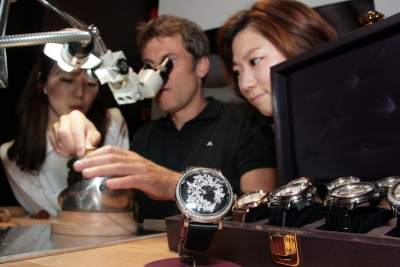 갤러리아명품관의 하이주얼리&워치 매장 ‘마스터피스존’에서 스위스 ‘바젤월드’ 부쉐론 신제품 22점을 국내 처음으로 선보인다. 23일 부쉐론의 딕 스틴만 수석 시계 장인이 1억원 상당의 신제품 ‘디 아트’를 조립하는 제작과정 시연을 하고 있다.