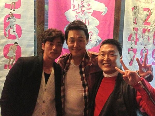 사진 속 싸이는 박성웅, 김강우와 함께 다정하게 어깨동무를 한 채 카메라를 응시하고 있다 .