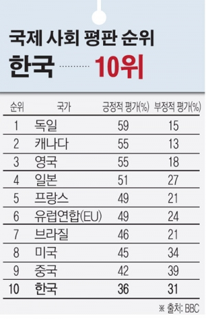 영국 BBC방송은 23일(현지시간) 세계 16국과 유럽연합(EU)을 대상으로 실시한 조사에 따르면 ‘한국이 국제사회에 긍정적인 영향을 미친다’는 응답이 지난해 같은 기간보다 1%포인트 감소한 36%를 기록했다. ‘부정적인 영향을 미친다’는 응답은 지난해보다 4%포인트 높아져 31%를 기록했다.