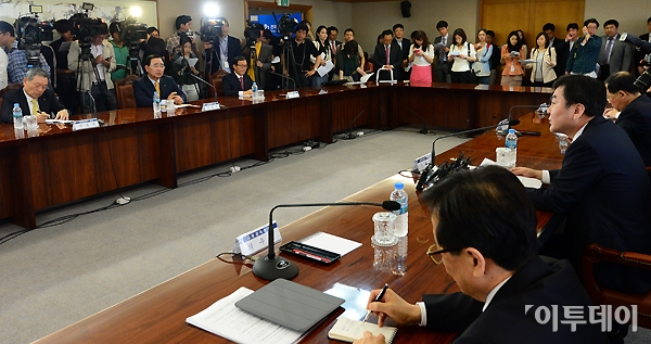 신제윤 금융위원장이 24일 오전 명동 전국은행연합회에서 금융지주회사 회장들과 간담회를 갖고 인사말을 하고 있다. 이날 가진 간담회는 신제윤 금융위원장과 최수현 금융감독원장이 취임 후 처음으로 금융지주회사 회장들과 가진 자리이다. 노진환 기자 myfixer@