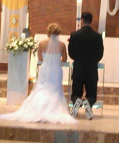 이 사진에는 결혼식장에서 신랑과 신부가 무릎을 꿇고 앉아있는 모습이 담겨 있다. 특히 무릎을 꿇은 신랑의 구두 바닥이 하객들에게 공개됐는데 거기에는 ‘HELP ME(날 좀 도와줘)’라고 적혀 있어 웃음을 자아냈다.