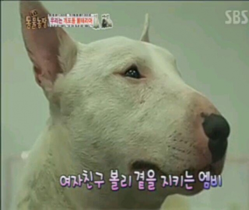 26일 SBS TV동물농장에서는 불테리어종 엠비가 나왔다. 엠비의 여자친구는 볼리이며 비비와는 삼각관계인 것으로 나타났다.