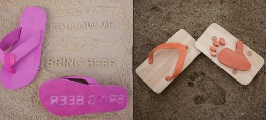 첫 번째 슬리퍼의 경우 왼쪽에는 ‘Follow Me(나를 따라와)’, 오른쪽에는 ‘Bring Beer(맥주를 가져오다)’가 새겨져있다. 걸음을 옮길 때 마다 두 가지의 글씨가 바닥에 새겨지는 원리다.