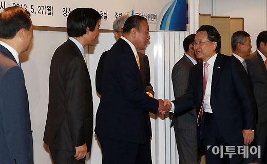 동반성장위원회가 27일 오전 서울 반포동 팔레스호텔에서 제23차 본회의를 열었다. 회의에 참석한 유장희 위원장이 참석자들과 악수를 나누고 있다. 양지웅 기자 yangdoo@