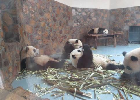공개된 사진 속에는 다섯 마리의 팬더와 그 주변에 먹다 남은 대나무들이 쌓인 모습이 담겨 있다. 한 팬더는 이미 나무데크 위에 널부러져 있고 한 팬더는 배가불러 아무 것도 할 수 없다는 표정으로 바닥에 멍한 표정을 짓고 누워있어 보는이들의 웃음을 자아낸다.