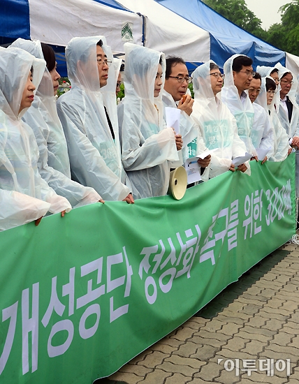 개성공단 출입 차단 조치가 취해진지 55일째를 맞는 27일 오전 정치인들과 종교인들이 국회 정문 앞에서 ‘개성공단 정상화 촉구를 위한 3000배’를 올렸다. 김성곤 민주당 의원이 정상화를 촉구하는 성명서를 읽고 있다. 노진환 기자 myfixer@