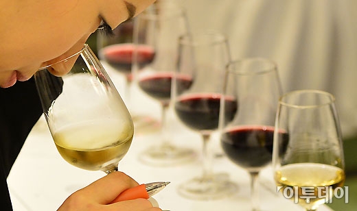 '제12회 한국 소믈리에 대회'가 27일 서울 강남구 코엑스 인터컨티넨탈에서 열렸다. 이날 대회에 참가한 소믈리에들이 와인의 맛과 향에 집중하고 있다. 양지웅 기자 yangdoo@