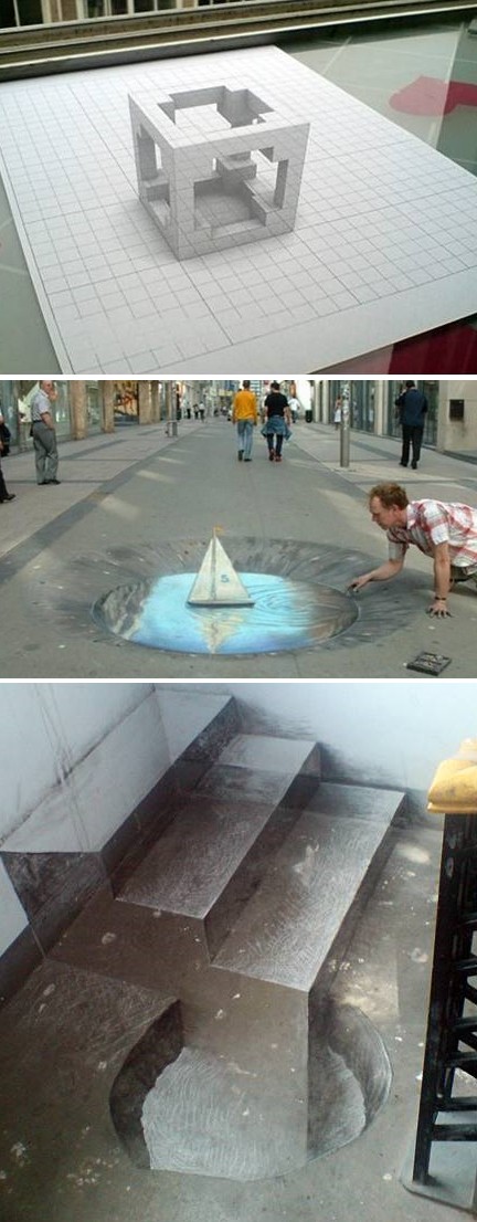 분필로만 그린 입체적인 투명 계단이 있는가 하면 길 한복한에 물이 고인 웅덩이에 작은 장난감 요트가 떠있다.