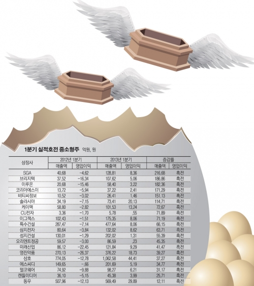 1분기 영업실적이 흑자로 전환된 중소형주가 주목받고 있다. 최근의 실적 호전 중소형주 강세는 경기 둔화 국면에 나타난 것으로 투자자들의 시장에 대한 신뢰가 부족해 발생한 현상이다. 또 투자자들의 이러한 심리는 실적 호전주의 주가 상승이란 결과로 귀결되고 있다. 실제로 지난 24일을 기준으로 작년 말 대비 대형주가 많은 코스피지수는 1.18% 하락한 반면 중소형주가 다수인 코스닥시장은 15.67% 상승했다. 이에 증시 전문가들은 당분간 중소형주 중에서도 실적 호전주 중심의 종목별 차별화 강세가 지속될 가능성이 높은 것으로 내다보고 있다.