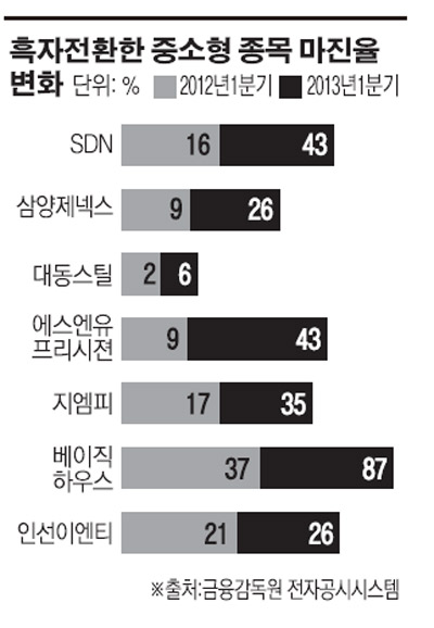 매출액은 줄었지만 매출총이익률이 상승하면서 흑자 전환에 성공한 다른 중소형주들의 주가도 호조세를 보이고 있다. SDN의 매출은 전년 동기 대비 10%포인트 가량 하락한 104억원을 기록했다. 반면 매출총이익률은 10%포인트 상승한 27%를 보이면서 영업적자는 9억원의 흑자로 돌아섰다. 주가도 올해 들어 8% 가량의 상승률을 보이고 있다.