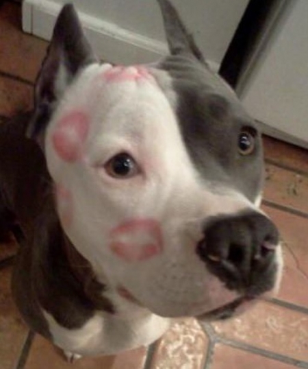 사랑받은 티 나는 개 사진에는 개의 얼굴이 클로즈업 돼있는데 개 얼굴에는 립스틱 자국이 잔뜩 묻어있어 웃음을 자아낸다.