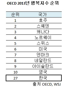 한국이 경제협력개발기구(OECD)가 세계 선진국 36국을 대상으로 집계한 ‘2013년 행복지수(Better Life Index)’에서 하위권인 27위에 그쳤다고 28일(현지시간) 월스트리트저널(WSJ)이 보도했다.