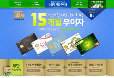 G마켓이 이달 말까지 신한, 현대, KB국민, 롯데, 하나SK 등 5대 카드사와 제휴를 맺고 15개월 무이자 할부 프로모션을 진행한다.