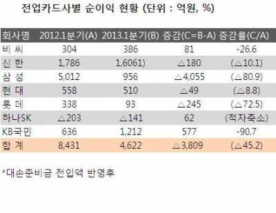 금융감독원이 28일 발표한‘1분기 신용카드사 경영실적’에 따르면 전업카드사 7곳의 1분기 순이익(대손준비금 반영 후 조정이익)은 전년동기 대비 45.2% 감소한 4622억원인 것으로 집계됐다.