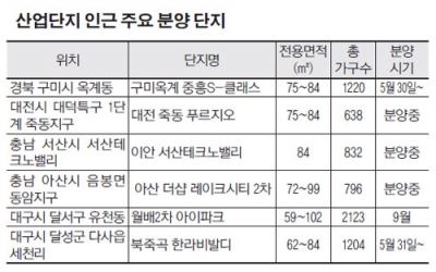 신규 분양 아파트도 청약경쟁률 고공행진이 이어지고 있다. 국내 과학기술의 산실인 대덕연구단지 배후의 ‘대전 죽동 푸르지오’는 지난 3월 분양해 최고 2.37대 1, 평균 1.43대 1의 경쟁률을 기록했다. 지난달 분양한 ‘아산 더샵 레이크시티 2차’ 역시 단지 인근 세계 최대 LCD 관련 산업단지인 삼성디스플레이시티가 위치한 점이 부각되면서, 3순위 청약 접수에서 평균 1.8대 1의 경쟁률을 기록했다.