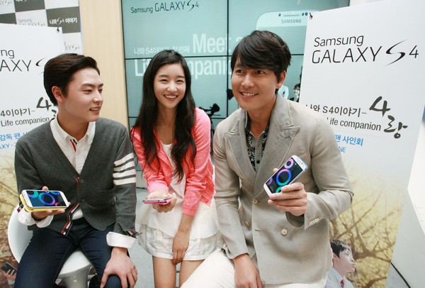 삼성전자는 갤럭시S4의 브랜드 필름 ‘나와 S4 이야기’ 중 ‘4랑’ 편을 연출한 정우성 감독과 주연배우 서예지양, 조승현군이 지난 29일 코엑스 갤럭시존에서 팬 사인회를 가졌다고 30일 밝혔다. 정우성 감독과 출연 배우들이 함께 갤럭시S4의 ‘그룹 플레이’ 기능으로 음악을 공유하고 있다.