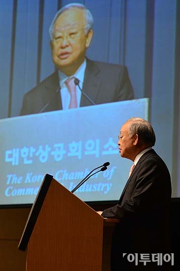 손경식 대한상공회의소 회장이 30일 오전 서울 중구 대한상공회의소에서 열린 ‘서승환 국토교통부 장관 초청 조찬강연회’에서 인사말을 하고 있다. 방인권 기자 bink7119@