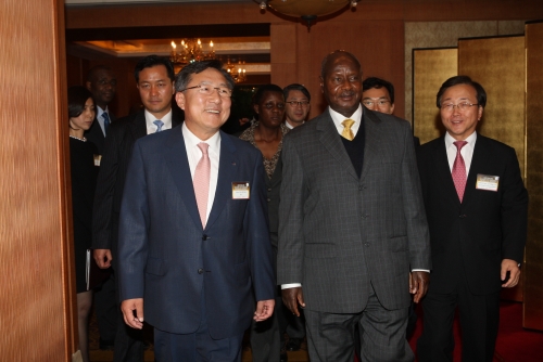 김기문 중소기업중앙회장(왼쪽)이 요웨리 무세비니 우간다 대통령(가운데), 이동근 대한상의 상근부회장과 함께 29일 소공동 롯데호텔에서 열린 무세비니 우간다 대통령 초청 경제4단체 만찬 간담회 장소로 이동하고 있다. (사진=중소기업중앙회)