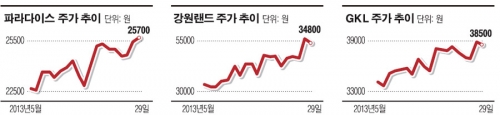파라다이스는 지난 21일 2만5900원으로 신고가를 갱신했고 또 다시 경신에 0.77%만 남겨두고 있고 강원랜드도 29일 장중 신고가를 경신했다. GKL 역시 28일 신고가를 경신하는 등 동반 강세를 보이고 있다.