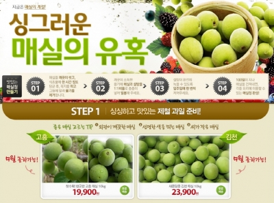 고흥, 김천, 하동, 구례, 보성 등 국내 대표 매실산지에서 친환경으로 재배해 올해 첫 수확한 다양한 매실 상품을 만나볼 수 있다. 본격적으로 상품이 출하되는 6월 10일 이전까지 사전예약판매로 진행된다. 10kg당 1~2만원대 가격에 저렴하게 판매한다. ‘향긋한 고흥매실’은 1만9900원, ‘무농약 구례 청매실’은 2만4900원에 선보인다.