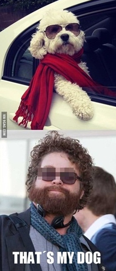 이 사진에는 개 한 마리가 머플러에 선글라스를 낀 채 남다른 패션 감각을 과시하고 있고, 사진 아래에는 선글라스에 머플러를 착용한 남성의 모습이 담겨 있다.