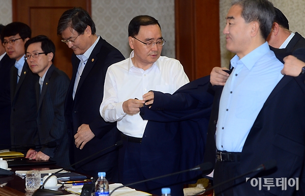 정홍원 국무총리가 31일 오전 세종로 정부서울청사에서 열린 국가정책조정회의에 참석해 회의를 시작하기 전 상의를 탈의하고 있다. 노진환 기자 myfixer@